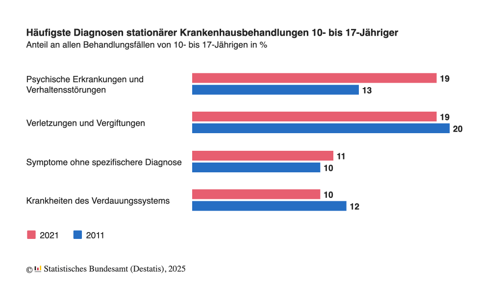 In Deutschland erfüllt mehr als jeder vierte Erwachsene jährlich die Kriterien einer psychischen Erkrankung, oft Angststörungen oder Depressionen, die auch Hauptursache für Arbeitsunfähigkeitstage sind, welche sich in den letzten Jahren deutlich erhöht haben. Psychische Erkrankungen waren 2021 die häufigste Ursache für Krankenhausbehandlungen von 10- bis 17-Jährigen, vgl. Statistisches Bundesamt.
